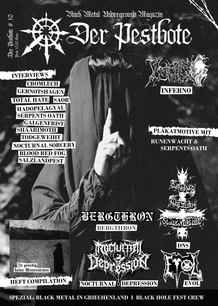 Interviews: NOCTURNAL DEPRESSION (fra), INFERNO (cz), EVOL (it), DARKENED NOCTURN SLAUGHTERCULT (de), BERGTHRON (de), SAOR (uk), TOTAL HATE (de), TODGEWEIHT (de), NOCTURNAL SORCERY (fin), SERPENTS OATH (be), GERNOTSHAGEN (de), BLOOD RED FOG (fin), GALGENFRIST (de), HADOPELAGYAL (de), CROMLECK (de) SALZLANDPEST (de), SHAARIMOTH (no)…